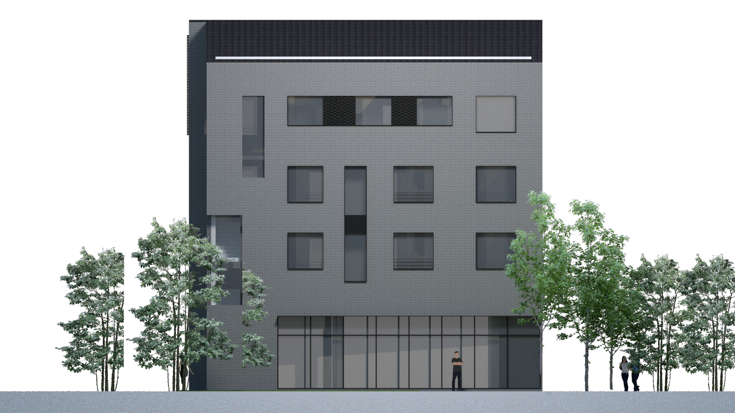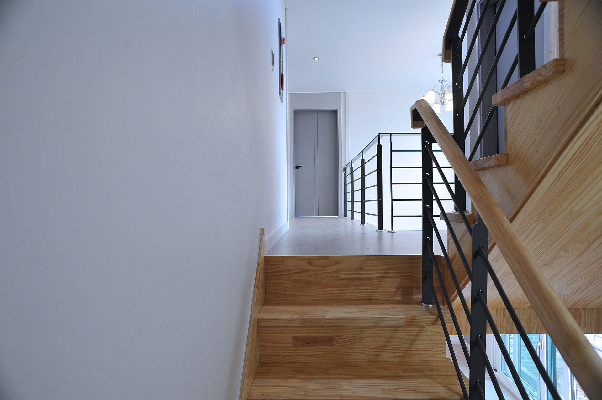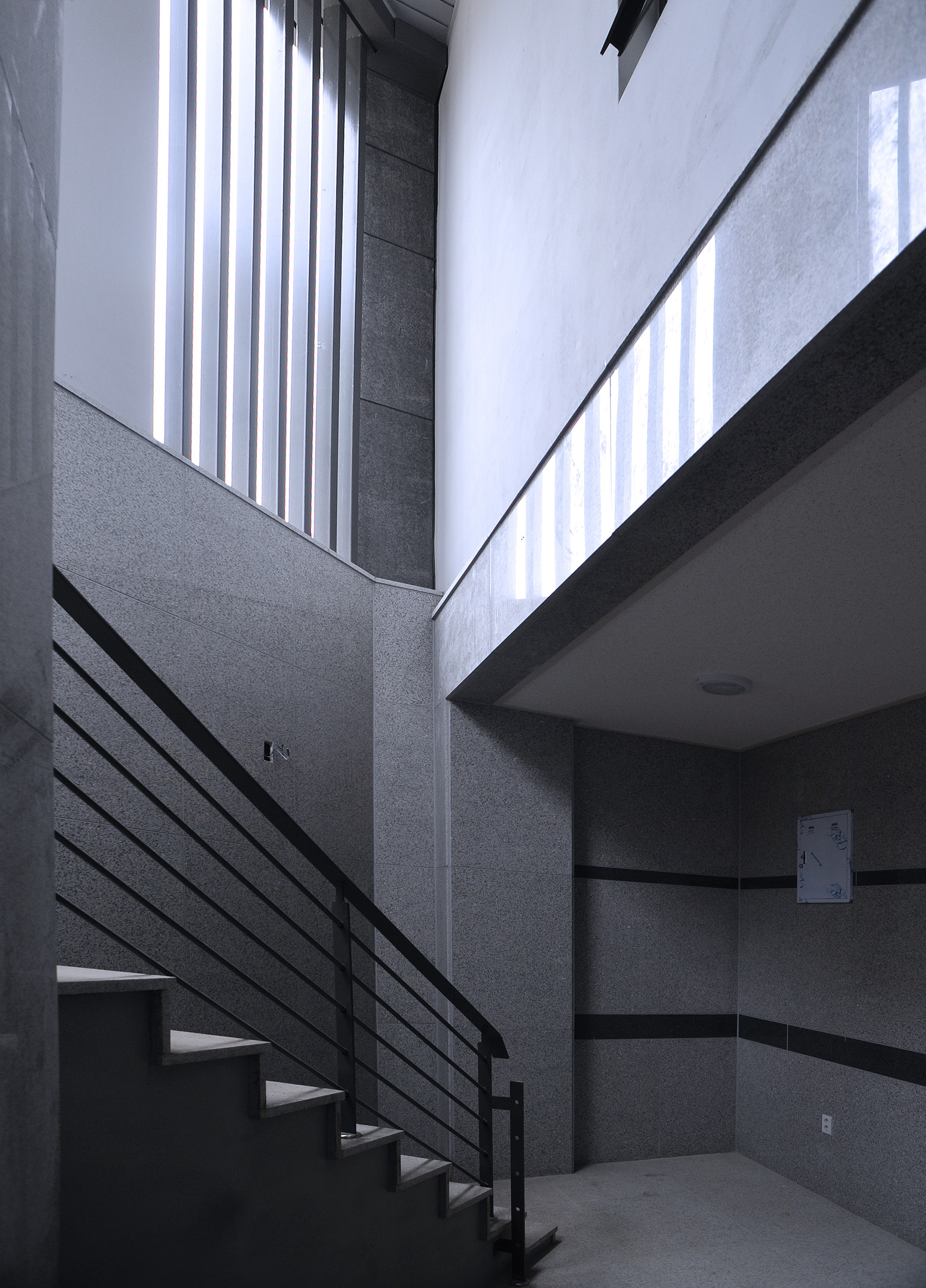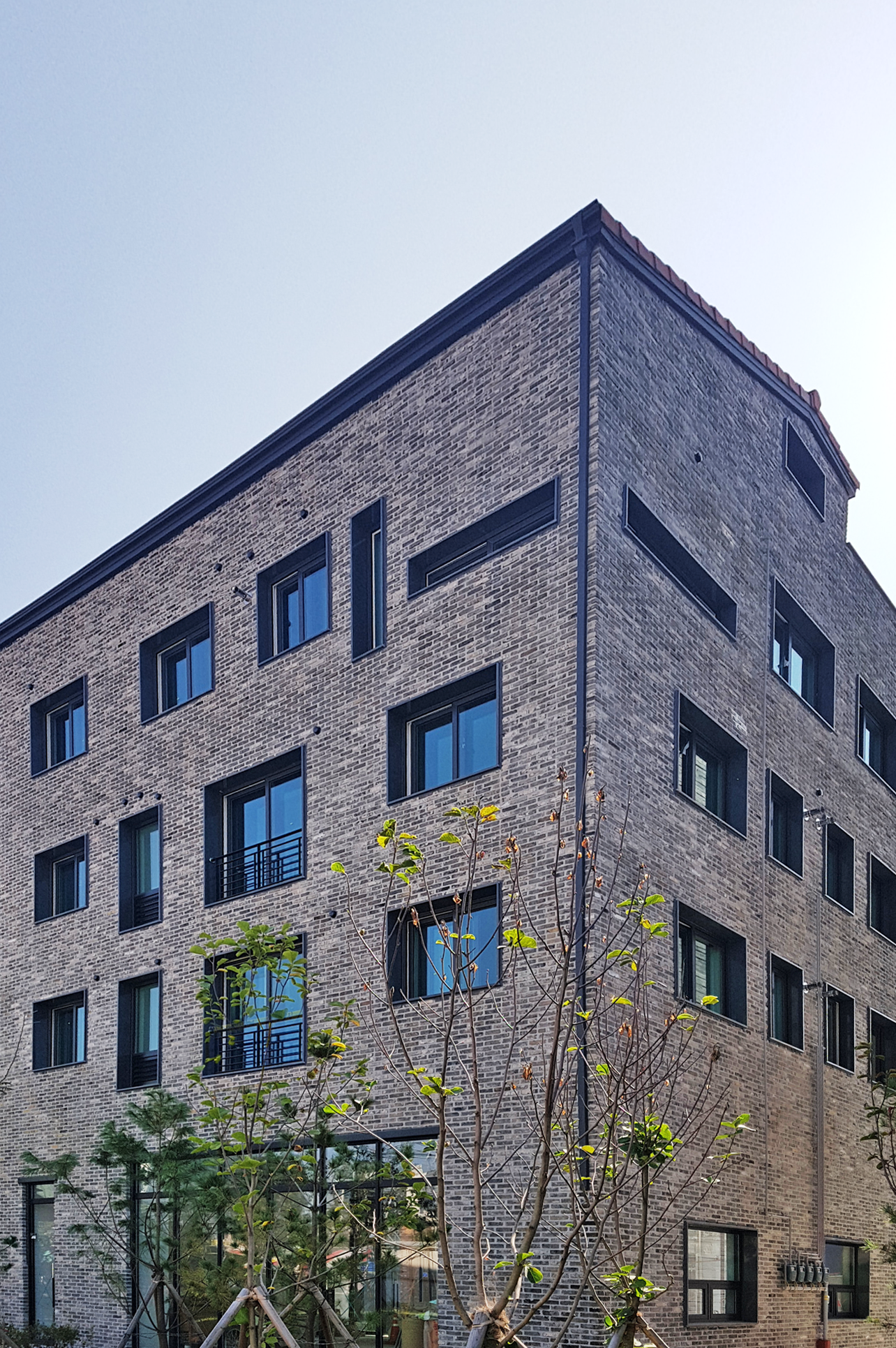 과도한 디자인을 피하되 개성 없는 건물이 되기를 원하지 않는 건축주의 희망사항을 반영한 디자인 - 외부 주재료는 회색계열 전벽돌, 창호주변은 블랙계열 철재프레임, 전면부 포인트로 레드계열 도장 철판, 우측 최상층은 벽돌쌓기 방법을 다르게 하여 한정된 건축비용 안에서 - 단조롭지 않은 설계를 완성했습니다. 근생주택은 건축가가 경제성에 대한 고려 없이 디자인이라는 미명하에 경제성과 시공성을 무시하며 자신의 주장만을 세울 수 없습니다. 시공성, 그리고 가성비에 대한 고민을 통해 주변 환경과 어우러지면서 개성도 겸비한 건축물이 될 수 있었습니다.